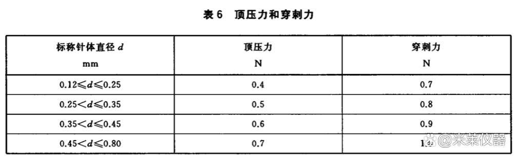針灸針的針尖部位應(yīng)圓正不偏,無(wú)毛刺、彎鉤等缺陷,施加規(guī)定的力與鋼塊接觸頂壓后,其穿刺力應(yīng)不大于表6規(guī)定。