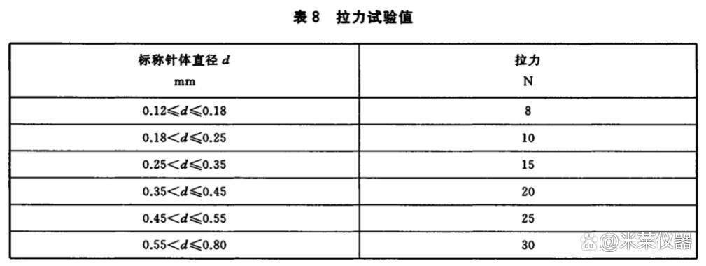 針體與針柄的連接應(yīng)牢固,在表8規(guī)定的力值下作拉力試驗(yàn),二者軸向位移不得大于3mm。先測(cè)量針體長(zhǎng)度,然后將針體固定在夾具中,在針柄的端面上沿針體軸向緩慢加力作無(wú)沖擊拉力試驗(yàn)至表六6規(guī)定的力值后,再測(cè)其針體長(zhǎng)度。